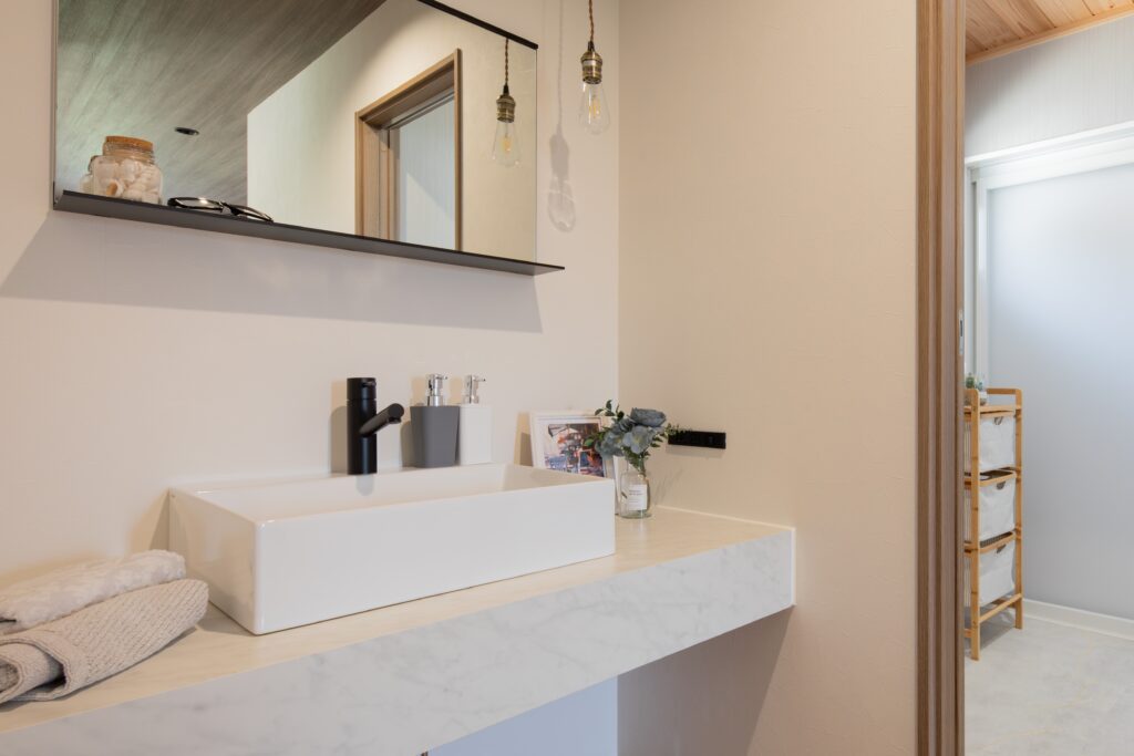 洗面スペースには造作カウンターの洗面化粧台を設け、
