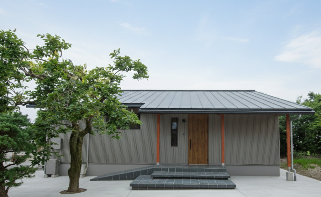 玄関ポーチにはシックなタイルを採用し、スロープを設けることで、