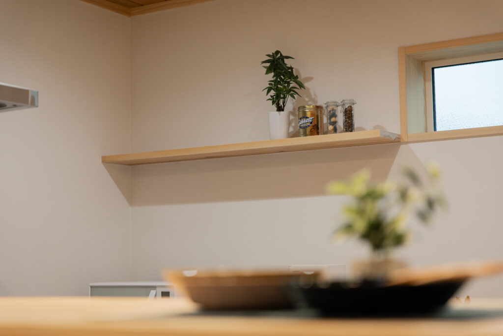 カップボード上部には飾り棚を設け、お気に入りの食器や小物をディスプレイできるなど、